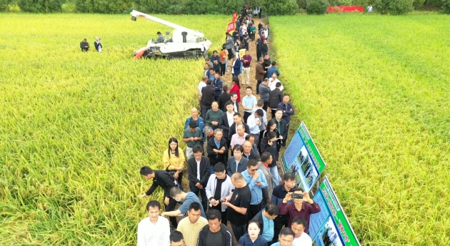 在實(shí)測現場(chǎng),來(lái)自中國農科院、省農科院、我院的水稻專(zhuān)家們隨機選取了一處一畝大小田塊進(jìn)行機械實(shí)收,經(jīng)過(guò)除雜、稱(chēng)重、測水分等流程,最終得出該示范片的平均畝產(chǎn)達到1440斤的產(chǎn)量。