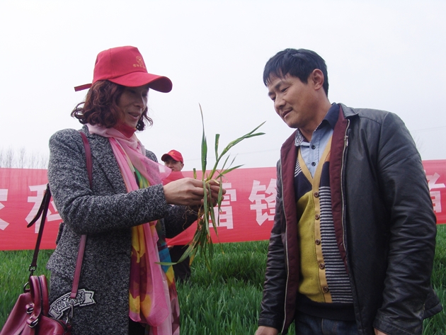 我院小麥專(zhuān)家周?chē)诟毖芯繂T對當地50多名農民群眾進(jìn)行了小麥中后期田間管理技術(shù)的培訓,講解了分類(lèi)施肥、預防倒春寒、及時(shí)清溝降漬、防治病蟲(chóng)害等小麥中后期田間管理的關(guān)鍵技術(shù),并對他們在種植過(guò)程中提出的各種問(wèn)題給予了詳細的解答。培訓結束后,市農科院專(zhuān)家們還來(lái)到道明種植業(yè)合作社小麥種植基地,查看了土壤墑情和小麥苗情,周?chē)诟毖芯繂T還對其中一塊小麥因除草劑使用不當造成的黃苗、死苗現象進(jìn)行了現場(chǎng)講解,根系發(fā)育不良、分蘗減少、株高降低、葉片發(fā)黃、嚴重影響產(chǎn)量,這些因人為因素導致的藥害癥狀觸目驚心,極大地震撼了在場(chǎng)的每一個(gè)人,也使大家深刻認識到科學(xué)種田的重要性。