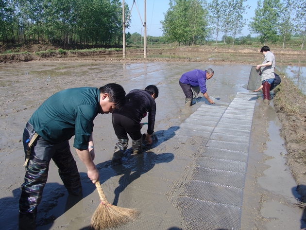 豫南水稻“秈改粳”項目主持人、“泥質(zhì)法”育秧技術(shù)發(fā)明人、我院宋世枝研究員向與會(huì )人員介紹了“泥質(zhì)法”育、拋秧的重大意義、技術(shù)原理和操作規程,團隊成員就“泥質(zhì)法”育秧技術(shù)的秧田整理、擺盤(pán)填漿、塌谷播種、無(wú)紡布覆蓋等關(guān)鍵技術(shù)環(huán)節進(jìn)行了操作演示,現場(chǎng)指導了“泥質(zhì)法”育秧的全部過(guò)程。