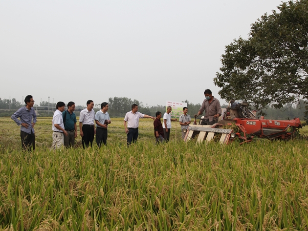 在水稻收獲期間,信陽(yáng)師范學(xué)院副校長(cháng)劉彥明、信陽(yáng)師范學(xué)院生命科學(xué)院院長(cháng)袁洪雨一行在我院黨委書(shū)記韓勛來(lái)的陪同下考察了示范基地。