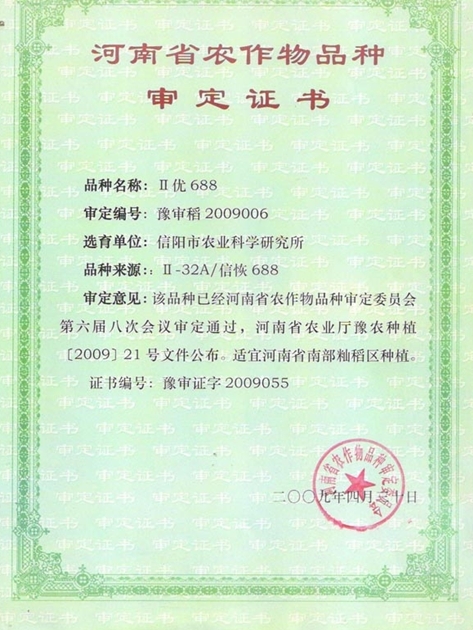 II優(yōu)688以不育系II-32A為母本,自育恢復系信恢688作父本測交組配而成,在河南省水稻品種中間試驗中平均畝產(chǎn)稻谷579.1公斤,比對照增產(chǎn)7.23%。2009年4月通過(guò)河南省品種審定委員會(huì )審定,2015年11月獲農業(yè)部植物新品種權證書(shū)。河南省農科院查新報告認為:Ⅱ優(yōu)688在近十年來(lái)河南省審定的50個(gè)中秈稻品種中,產(chǎn)量表現突出,并具有多抗、優(yōu)質(zhì)等特點(diǎn),具有廣闊的推廣應用前景。