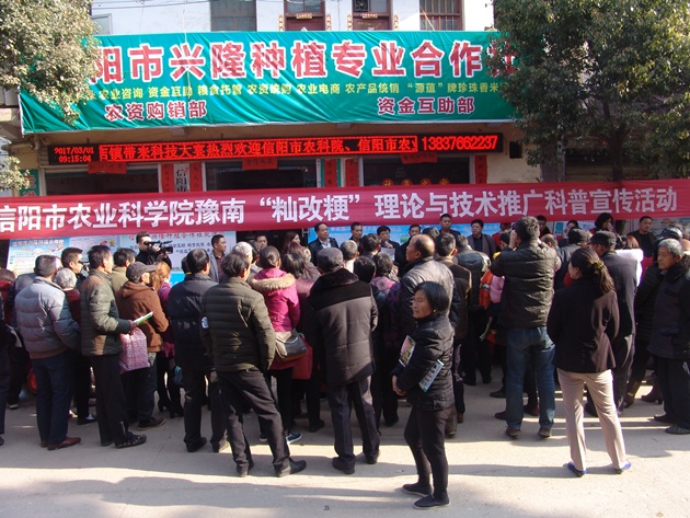 3月1日,農歷二月初四,恰逢浉河區吳家店鎮農村大集,我院在該鎮開(kāi)展了河南省科技傳播工程項目豫南“秈改粳”理論與技術(shù)推廣的科普活動(dòng)。項目主持人、市科技特派員、我院宋世枝研究員率本院部分水稻、植保等方面專(zhuān)家參加了活動(dòng)。市農技站、浉河區農業(yè)局負責同志與技術(shù)人員,信陽(yáng)農科種業(yè)、天津天隆科技信陽(yáng)分公司、河南國豪種業(yè)、信陽(yáng)興隆種植專(zhuān)業(yè)合作社等涉農企業(yè)也參加了此次活動(dòng)。