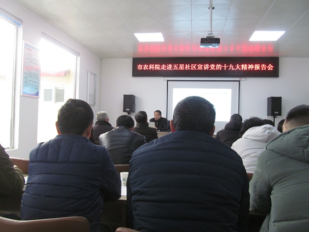 1月11日上午,我院和市農業(yè)局、市畜牧局走進(jìn)浉河區湖東辦事處五星社區,開(kāi)展了“學(xué)習貫徹十九大 文明單位社區行”活動(dòng),會(huì )上發(fā)放了《十九大精神宣講讀本》,舉行了重溫入黨誓詞宣誓儀式,社區居委會(huì )全體工作人員及部分五星社區黨員50余人聆聽(tīng)報告。