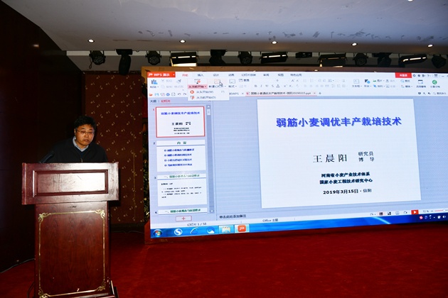 2019年河南省新型主體小麥市場(chǎng)、技術(shù)及政策培訓會(huì )于3月14日—16日在信陽(yáng)舉行。國家小麥產(chǎn)業(yè)體系首席科學(xué)家肖世和研究員,國家小麥產(chǎn)業(yè)經(jīng)濟研究室主任韓一軍教授,河南省小麥產(chǎn)業(yè)技術(shù)體系首席科學(xué)家雷振生研究員,國家小麥工程技術(shù)研究中心副主任王晨陽(yáng)研究員到會(huì )指導并授課。院黨委書(shū)記李杰、市農業(yè)農村局黨組成員華日紅出席會(huì )議并致辭。國家小麥產(chǎn)業(yè)技術(shù)體系和河南省小麥產(chǎn)業(yè)技術(shù)體系部分崗位專(zhuān)家和試驗站站長(cháng)以及來(lái)自信陽(yáng)及周邊地區的種麥大戶(hù)、麥農合作社、小麥種子生產(chǎn)銷(xiāo)售企業(yè)、小麥收儲加工流通企業(yè)、小麥研發(fā)技術(shù)人員、農業(yè)技術(shù)推廣部門(mén)負責人等160多人參加了培訓會(huì )。