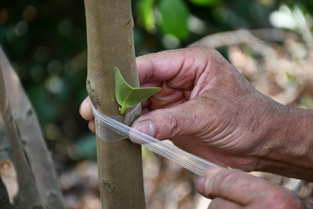 丁向陽(yáng)現場(chǎng)演示了撕皮嫁接技術(shù)的操作步驟,對砧木處理、切削接穗、插接穗、捆綁包扎等每個(gè)環(huán)節的操作要領(lǐng)作了詳細的說(shuō)明。他介紹說(shuō),該技術(shù)節省人工、材料,成本較低,與傳統的油茶嫁接技術(shù)相比具有成活率高、嫁接成活后植株生長(cháng)旺盛等突出優(yōu)點(diǎn),而且大大減少了除萌工作量,提高了油茶產(chǎn)量,在低產(chǎn)油茶改造中是最有效的一種方法。