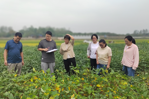在我院油料所所長(cháng)、大豆課題組組長(cháng)金開(kāi)美、課題組張晶鵬等團隊成員的陪同下,耿臻一行深入探訪(fǎng)了我院陸廟大豆試驗基地。她對試驗基地管理表示認可,并與現場(chǎng)科研人員就大豆生長(cháng)狀況、品種特性及試驗設計等方面進(jìn)行了深入探討。