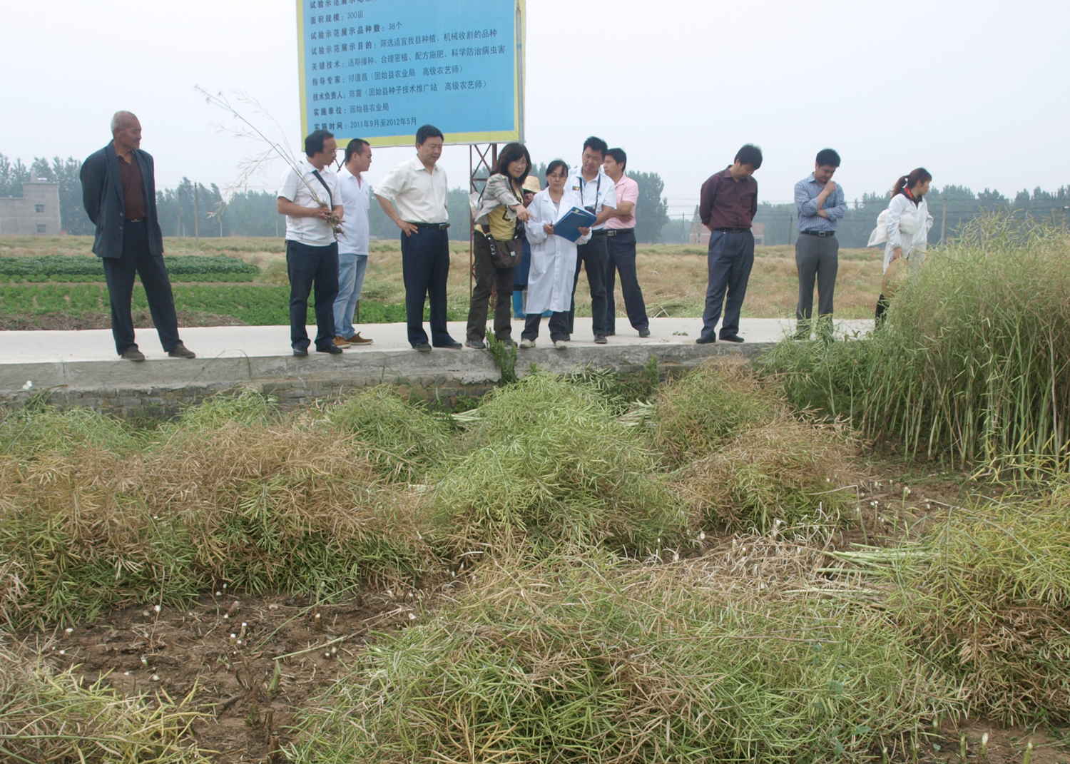 胡寶成一行首先來(lái)到固始縣沙河鄉油菜新品種、新技術(shù)示范基地,聽(tīng)取了沙河鄉負責人關(guān)于油菜新品種試驗、示范和全程機械化生產(chǎn)情況的介紹,開(kāi)展了油菜黑脛病、菌核病田間發(fā)生情況調查,并與王友華研究員探討了沙河鄉油菜黑脛病、菌核病發(fā)生較重的原因。專(zhuān)家們一致認為,兩種病害之所以發(fā)生較重,主要是與當地油菜多年重茬和今年雨水多,田間濕度大等因素造成的。胡寶成院長(cháng)提出:在油菜收獲后,應深耕滅茬或將病殘株集中銷(xiāo)毀;來(lái)年可選用抗病油菜品種或與非十字花科作物進(jìn)行輪作,以減少病害的發(fā)生。胡寶成一行還參觀(guān)了信陽(yáng)油菜綜合試驗站在羅山縣龍山鄉建立的千畝油菜機械化生產(chǎn)示范基地,對該基地高質(zhì)量的種植水平和大力推廣應用新品種、新技術(shù)給予了充分的肯定。